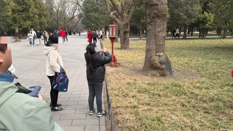 天坛公园,游客敲击手中坚果吸引松鼠。