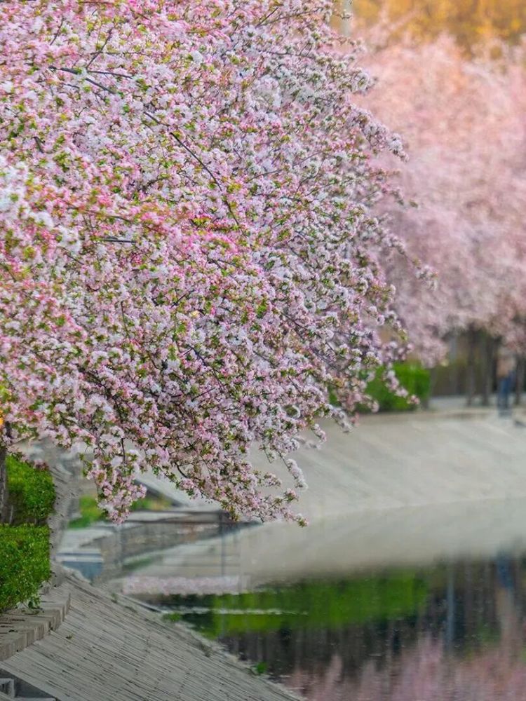 每到4月初,望京河畔两岸海棠花开得枝繁叶茂、花团锦簇,风一吹,花瓣如雨落下,整条河岸都被“染”成粉白色。花瓣落在水面,落在肩头🍃,落在春天的记忆里🌸。粉嫩的花枝透着光晕,在微风中摆动,倒映在河面,宛如油画。