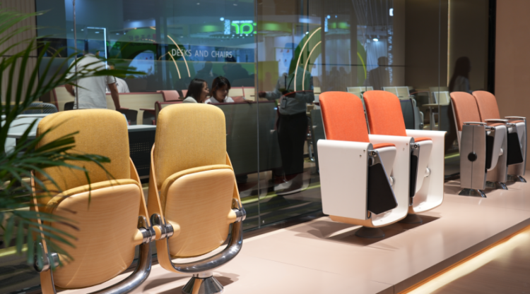 弘时专注于原创设计阶梯椅领域,专业生产礼堂椅、剧院椅、公共座椅、阶梯桌椅。此次展出的可调节高度与弧度的阶梯椅,针对国内基建与软装前期缺乏厂家沟通的行业痛点,可根据现场条件灵活适配;可双向旋转的会议椅则解决了会议室第一排领导起身需旁人让位的实际难题,成为现场关注度较高的产品之一。营销中心总监李永亮介绍,弘时坚持可持续原创设计,每年推出十余个新系列,产品广泛应用于高校、政企、剧院等公共空间,国内外市场同步布局。