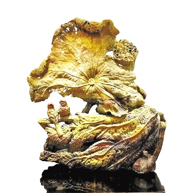 位于8号展厅的一组青田石雕《杏坛讲学》《圣门四科》《俎豆礼容》是生于浙江青田的玉石雕刻大师陈小甫的代表作,创作题材均取自典籍故事,人物造型参考了古代人物画。与之并列的一套四件石雕作品取名“春夏秋冬”,创作者徐伟军精心挑选了蓝星石、金玉冻、红花石和封门三彩等四种不同质地的石料,参照历代山水画的构图与意境雕刻完成。还有来自福建省的寿山石雕技艺传承人陈礼忠的作品《秋荷听雨》,无论是荷叶与小鸟的造型,还是整体的意境追求,无不与宋代花鸟画相契合。