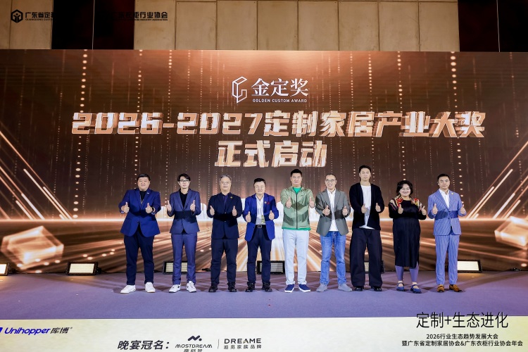 在隆重揭晓了金定奖获奖产品后,由金定奖发起人、广东省定制家居协会荣誉会长、索菲亚家居集团总工程师 张挺,金定奖发起人、广东衣柜行业协会荣誉会长、科凡家居董事长林涛,广东省定制家居协会会长、尚品宅配李嘉聪,广东衣柜行业协会会长、百得胜家居董事长张健,建筑学博士、竹工凡木设计集团创始人邵唯晏,ENJOYDESIGN创始人/总设计师郭捷,德国包豪斯大学中国区负责人/德国包豪斯设计精英大师协会秘书长马山山,马来西亚室内装潢伙伴协会主席郑生财,广东省定制家居协会/广东衣柜行业协会秘书长、博骏传媒创始人曾勇共同启动金定奖·2026-2027定制家居产业大奖。