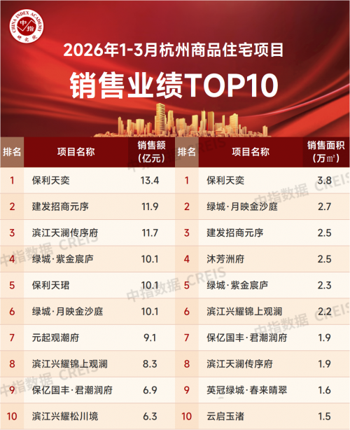 在这轮变化里,杭州保利天奕的成交表现比较醒目。根据房地产大数据服务品牌袋鼠汇发布的杭州项目成交汇总信息,杭州保利天奕(备案名:杭咏天奕府)3月成交307套;第三方地产研究机构中指研究院数据统计显示,2026年1—3月,保利天奕以13.4亿元销售额位居杭州商品住宅项目榜首,以3.8万平方米成交面积位居榜首。对一个处在结构性修复阶段的市场来说,这组数据已经不只是一个项目卖得好不好,也能看出改善型需求正在往哪里走。折射出改善型需求在政策窗口期内加快寻找落点的趋势。