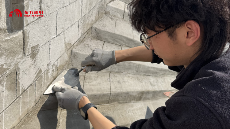 在基层施工环节,东方雨虹选用了墙倍丽外墙抗裂砂浆。凭借较强的粘结力、抗裂性和抗形变能力,既完美契合浮雕立体造型的塑形需求,更从基层保障墙体稳固,有效抵御户外复杂环境影响,让浮雕不空鼓、不开裂,实现长期留存。