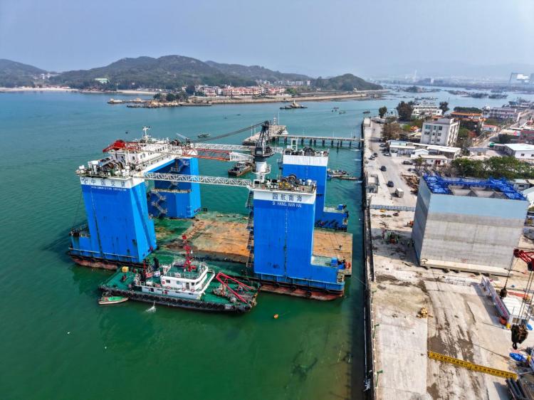 此次安装的首件沉箱体积达1028.8立方米、重约2521吨,是“水域变陆地”的关键一环,由“四航南海”号半潜驳和“粤工拖46”拖轮组成拖运编队,运抵安装现场。