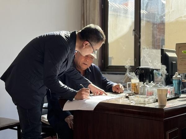 2024年11月5日,姚肖刚与柳沟村党支部书记胡宝祥商讨柳沟村乡村奥莱商街项目方案。通讯员 范楷/摄