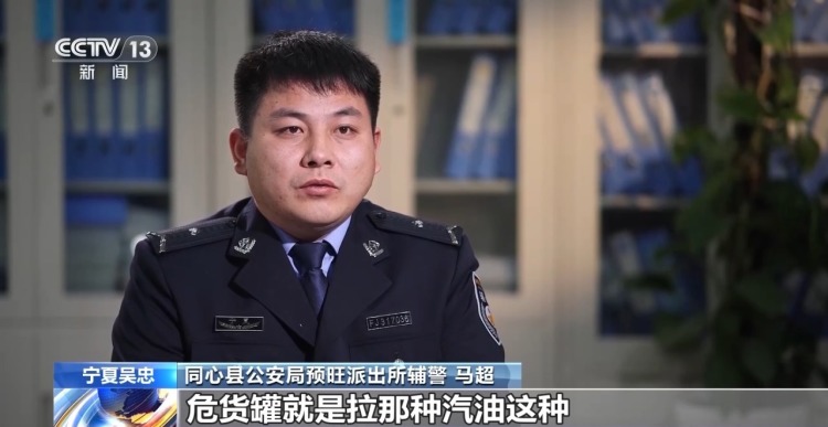 同心县公安局预旺派出所辅警 马超:咱们这边罐车是有一个危货罐,还有一个普货罐,危货罐就是拉汽油这种,比较危险,不能下去,但是涉事车辆后面写的是普货罐,没有危险品的那种。看到这个标识,杨国林先爬上去的,我带着执法记录仪,我从后面跟着爬上去。