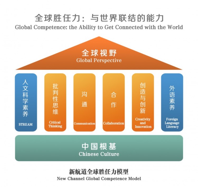 作为智能时代的教育共识,全球胜任力已经发展成一套较为成熟的体系,但其思想产生的历史和文化背景毕竟与当下的中国不同。胡敏教授所构建的“新航道全球胜任力模型”,将全球胜任力比作宏伟的大厦。大厦的最高点是宽广明亮的屋顶——全球视野,为青少年提供理解复杂世界的思维地图。为了承载恢弘的屋顶,需要坚实有力的结构:包括作为“硬能力”的人文科学素养与外语素养,和作为“软实力”的批判性思维、沟通能力、合作能力、创造与创新能力。支撑这一切的,是深植于中华文化与民族身份认同的坚固基石——中国根基。中国根基确保了整座大厦的稳固与独特,让中国青少年以更加自信与开放的姿态走向世界,在多元文化环境中保持独立判断与责任意识。