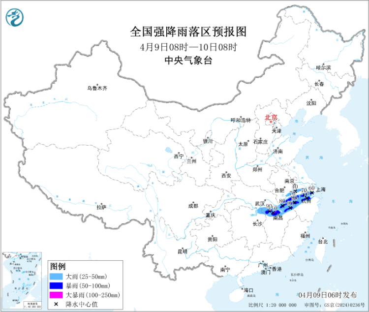 预计,4月9日8时至10日8时,安徽南部、江苏南部、湖北东南部、湖南东北部、江西北部、浙江北部等地部分地区有大雨,其中,安徽南部、江西北部、浙江北部等地部分地区有暴雨,局地大暴雨(100~110毫米)。上述部分地区伴有短时强降水(最大小时降雨量20~40毫米,局地可超过50毫米),局地有雷暴大风或冰雹等强对流天气。