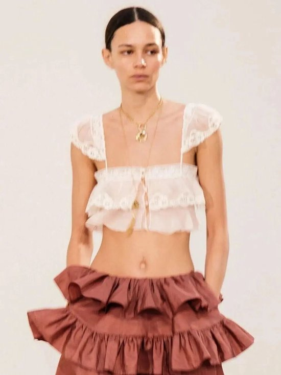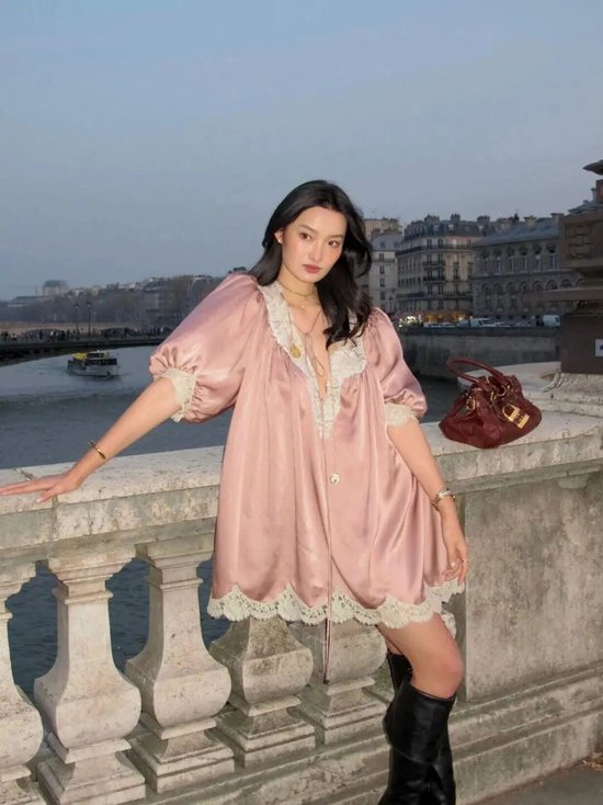 这种质感的重点在于“绒”与“雾”。马海毛、羊绒混纺的微绒感面料,表面带着一层细细的绒毛,像粉彩画里那种边缘模糊的笔触;水溶蕾丝,图案精致却不锋利,仿佛画布上勾勒出的藤蔓;还有带有肌理感的薄纱,不是那种硬挺的欧根纱,而是软塌塌、轻飘飘、像雾一样的材质。它们共同的特点是:自带柔光,边缘模糊。