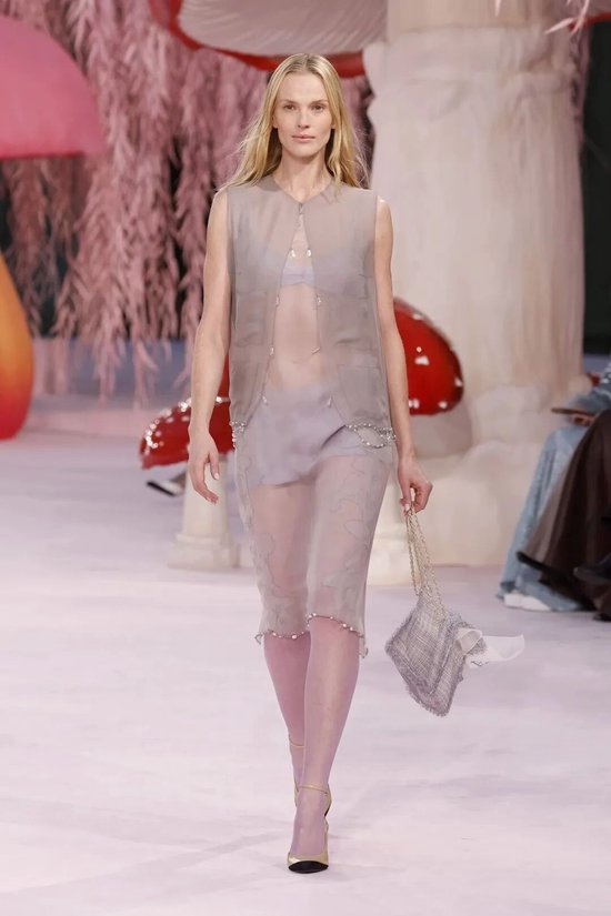 秀场上也是如此。LOUIS VUITTON 2026春夏女装系列,轻盈的粉彩系JellyCore出现在秀场上,颠覆人们对“居家衣橱”的固有认知。Prada运用裸色、奶白、水泥灰作为基底,以柔粉、浅薄荷绿、淡紫点缀,通过面料工艺与剪裁设计,呈现出兼具柔焦光晕与轻盈肌理的穿着效果。CHANEL也不例外,在Matthieu Blazy的手里,羽毛、亮片与科技感纤维交织,搭配粉色、浅橘色等缤纷色彩,打破季节与风格局限,低调耐看。