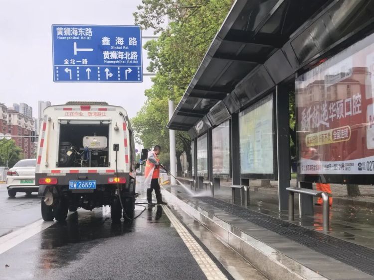 在东西湖临空港大道、金山大道、三店西路等路段,环卫公司采取“人机协同”作业模式,洒水车用高压水流稀释路面淤泥,机扫车同步吸扫泥浆沙石。针对路边死角、人行道缝隙、井盖周边等机械难以触及的区域,环卫工人逐一清理残留污渍与杂物,做到“清一处、净一处、通一处”。同时,环卫工人借助雨水冲刷的便利,对公交站台、交通护栏、垃圾桶等城市家具进行擦洗,去除水渍泥垢,使其焕然一新。