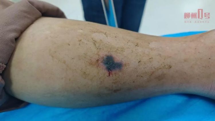 伍先生小腿被眼镜蛇咬伤,伤口周围皮肤已经发黑。