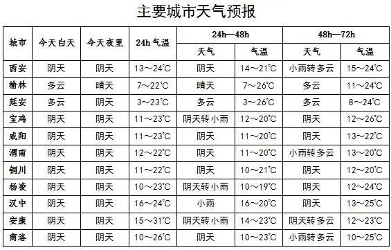 12日:全省阴天间多云,延安南部部分、关中部分、陕南大部有小雨。