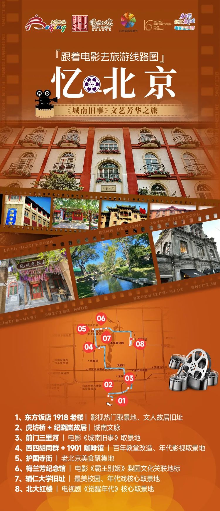 线路解说:这条文艺线路深挖京城城南文脉与人文底蕴,串联多部经典人文影视取景地,沉浸式感受老北京的风骨与烟火。从百年东方饭店启程,探访纪晓岚故居、前门三里河,复刻《城南旧事》旧时光;漫步西四胡同、打卡复古咖啡馆,品味文艺慢生活;途经护国寺街补足烟火滋味,再探访梅兰芳纪念馆、辅仁大学旧址,感受梨园文化与书香气息;最终抵达北大红楼,追寻先辈足迹,让人文情怀与光影记忆深度交融。