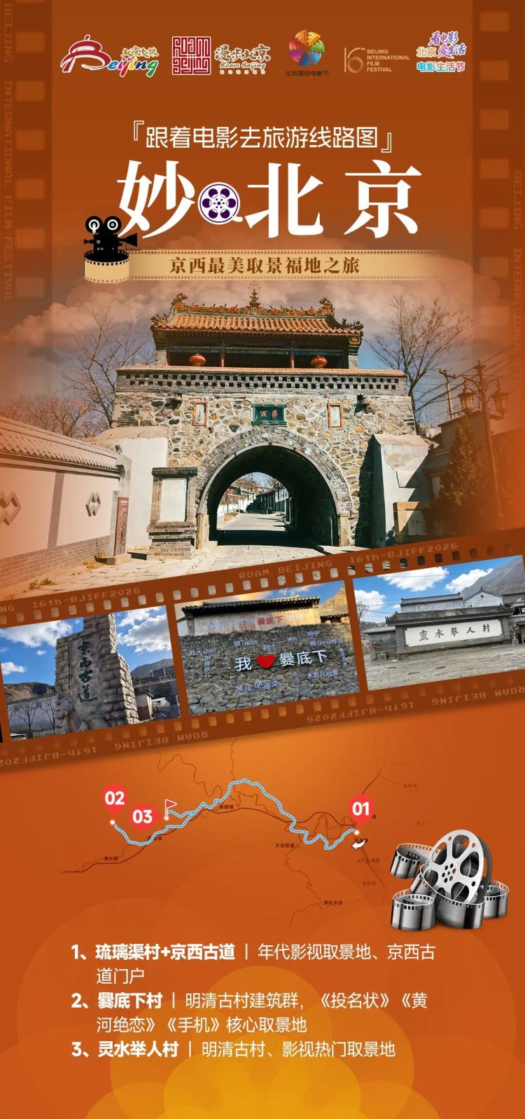 线路解说:京西山水胜景是北京的一块宝地福地,也是拍摄电影的天然外景地。深入京西深山,探寻藏在山野间的影视取景福地,沉浸式感受古村人文与山野秘境的碰撞。从琉璃渠村启程,漫步沧桑京西古道,感受年代影视的氛围感;抵达爨底下村,在明清古民居中打卡多部经典影片同款场景,解锁一线天、古宅院等银幕名场面;最后探访灵水举人村,在千年文脉与静谧山野间,回味影视里的隐秘故事,尽享古村探险的乐趣。