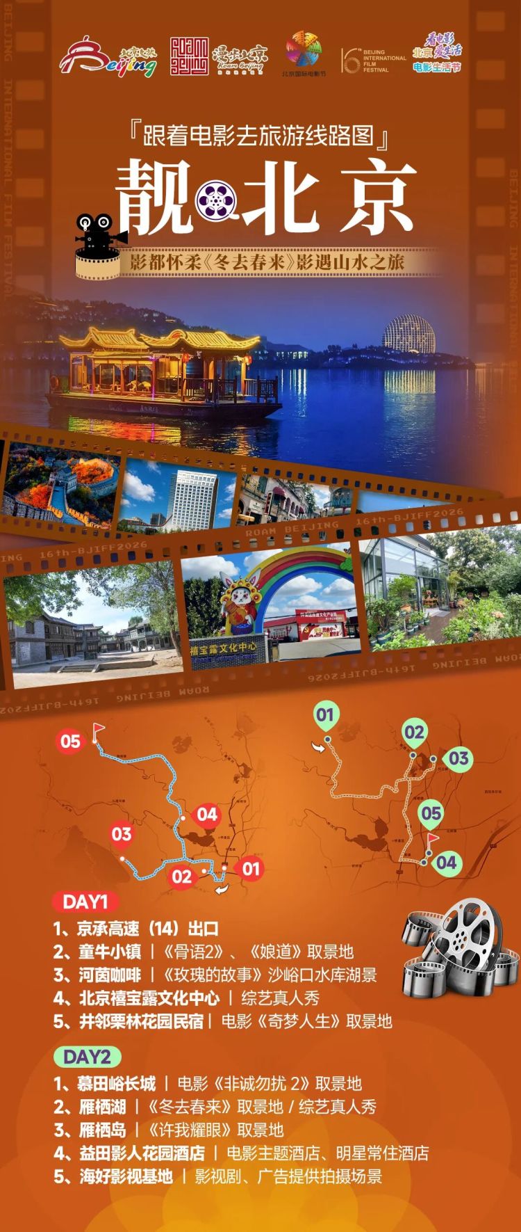 线路解说:走进怀柔“中国影都”,一站式解锁影视探秘、山水休闲与综艺打卡。漫步童牛小镇,打卡影视拍摄实景,沉浸式感受光影魅力;前往河茵咖啡,邂逅《玫瑰的故事》沙峪口水库湖景,定格浪漫瞬间;探访北京禧宝露文化中心,打卡综艺真人秀录制现场,体验非遗;入住井邻栗林花园民宿,复刻《奇梦人生》治愈诗意旅居。次日登临慕田峪长城,寻觅《非诚勿扰 2》经典镜头,尽览雄关壮美;漫步雁栖湖周边,打卡《冬去春来》影视、综艺等取景地,畅享山水休闲;登雁栖岛,邂逅《许我耀眼》同款高端场景,饱览湖岛风光;益田影人花园酒店品尝美食,沉浸电影主题氛围,体验明星同款旅居;最后走进海好影视基地,近距离感受影视剧、广告拍摄幕后场景。从影视取景地到长城湖山,综艺、影视与休闲相融,成就一段充实惬意的光影之旅。
