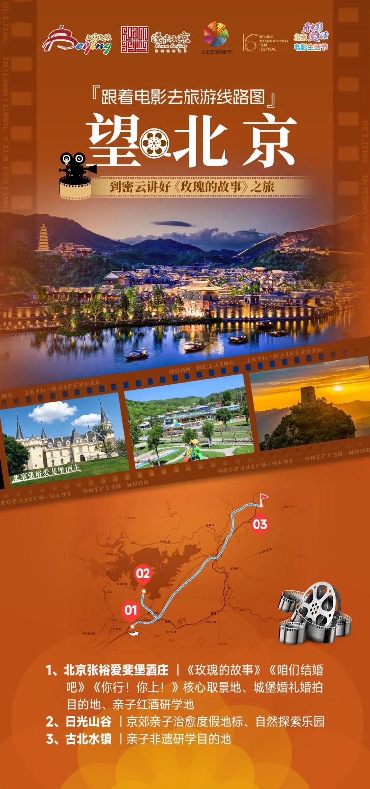 线路解说:这条亲子向光影线路串联京郊密云的三大宝藏目的地,把影视同款打卡与亲子休闲、自然研学、非遗体验完美融合。从张裕爱斐堡的欧式城堡出发,复刻《咱们结婚吧》浪漫名场面,带孩子解锁酿酒研学乐趣;再奔赴日光山谷,在山野绿野间放松身心,玩转各类童趣设施;最终抵达古北水镇,漫步青石板街巷打卡影视同款场景,夜游赏璀璨灯火,登顶司马台长城感受史诗风光,全程兼顾氛围感、趣味性与教育意义,打造专属全家的光影度假记忆。