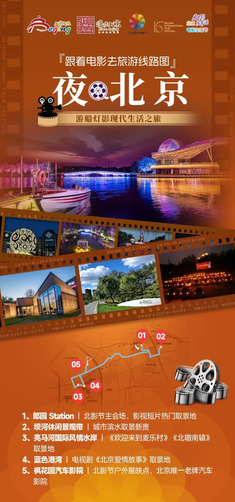 线路解说:这条夜游线路聚焦京城东部夜景地标,串联影视同款夜色场景,打造浪漫氛围感拉满的都市夜游体验。从郎园Station的工业风光影氛围启程,沿着坝河、亮马河漫步,欣赏水岸灯火与都市夜色,打卡多部爱情影片同款取景地;再到蓝色港湾畅享童话般璀璨夜景,最终抵达枫花园汽车影院,在星光与银幕光影间,解锁京城独有的户外观影浪漫,定格夜色里的心动瞬间。