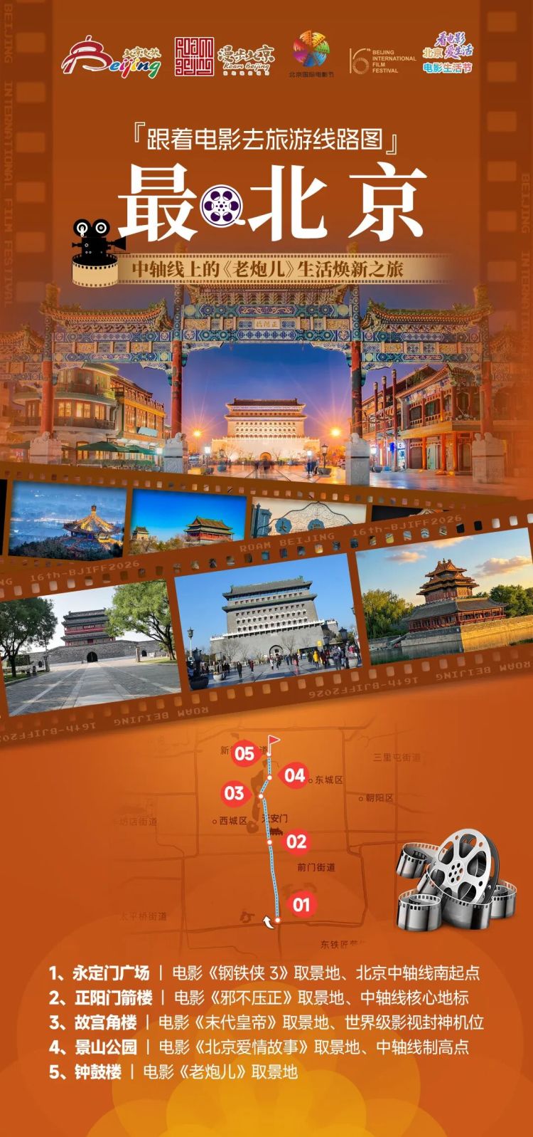 线路解说:沿着北京中轴线漫步,一站式打卡多部中外经典影视取景地,解锁世界遗产与光影交织的独特魅力。从永定门启程,贯穿正阳门、前门大街,感受百年商街的烟火文脉;驻足故宫角楼,定格《末代皇帝》同款封神画面;登顶景山俯瞰全城,尽览中轴全貌;最后抵达钟鼓楼,回味《老炮儿》里的老北京韵味,全程串联古今风华,读懂北京中轴线的厚重与浪漫。