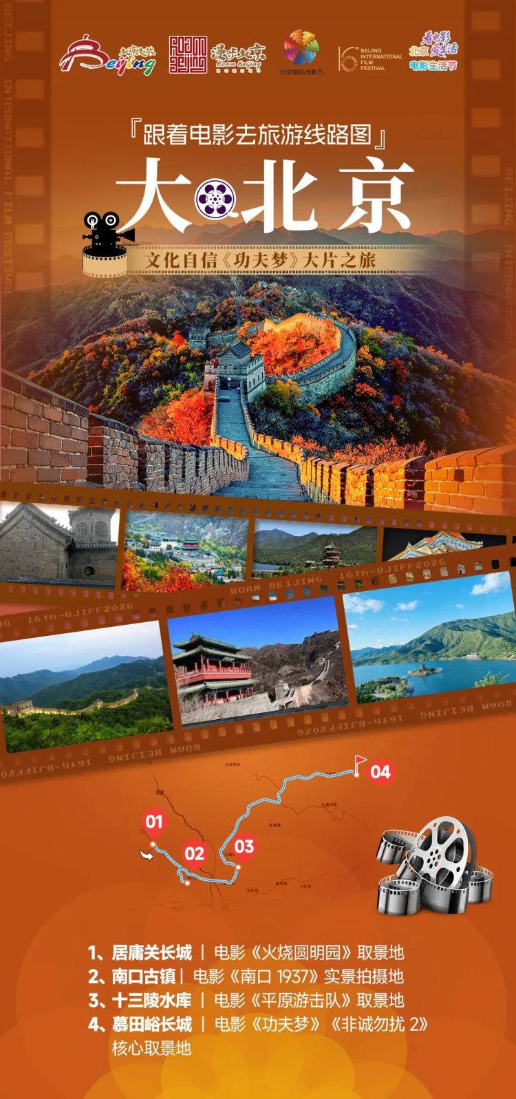 线路解说:从居庸关长城出发,追寻《火烧圆明园》的历史印记,感受雄关承载的百年沧桑;走进南口古镇,回望《南口1937》的烽火岁月,致敬抗战先辈的热血坚守;途经十三陵水库,邂逅《平原游击队》的经典红色记忆;最终抵达慕田峪长城,在《功夫梦》的励志特训地感受成长力量,在《非诚勿扰2》的浪漫取景地邂逅温情诗意,一站式解锁大北京的影视传奇与山河盛景。