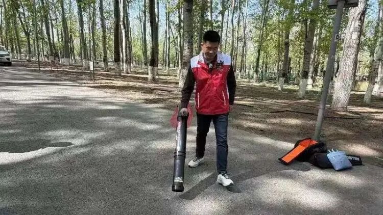 由绿友集团研发的轻便手提式杨柳飞絮吸收机也已全面投入使用。“普通吸尘器抽吸过程中易吹散飞絮,难以有效收集。这款设备实现了飞絮精准定向吸取,不会带走其他杂物。”据工作人员介绍,该设备整机长约1米、重1.4公斤,轻便易操作,可高效清理居民区、道路边角等人工清扫难度大的区域的落地飞絮,同步消除飞絮堆积引发的火灾隐患。“今年我们特意对机器进行了改进,加了一个过滤网,防止吸入头发等堵塞风机。”