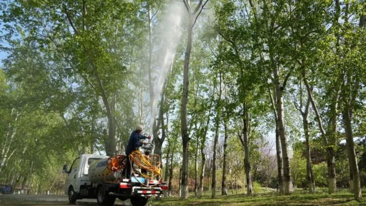 在奥林匹克森林公园,园林绿化工人向树木喷施杨柳飞絮凝絮剂。北京市园林绿化局供图