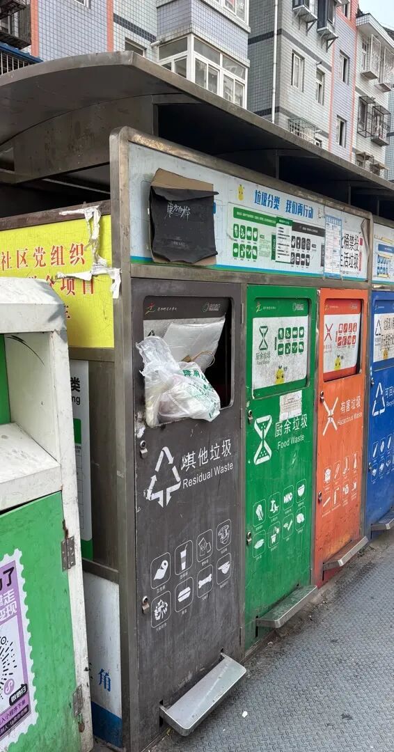 丽景园小区,智能桶站前敞口垃圾桶“如影随形”