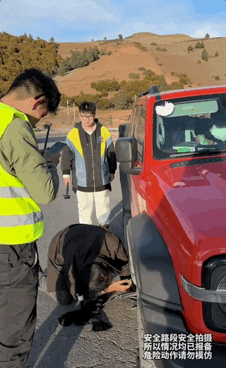 小货车司机是一位藏族大哥,双方语言沟通不太顺畅。警察在电话中建议她们先修补轮胎,他们随后就到。为避免影响道路通行,闫一鹤将车挪到了安全地带。后来,几个同样在西藏自驾游的年轻人看到,主动过来伸出援手,与藏族大哥一起帮她们换上了备胎。