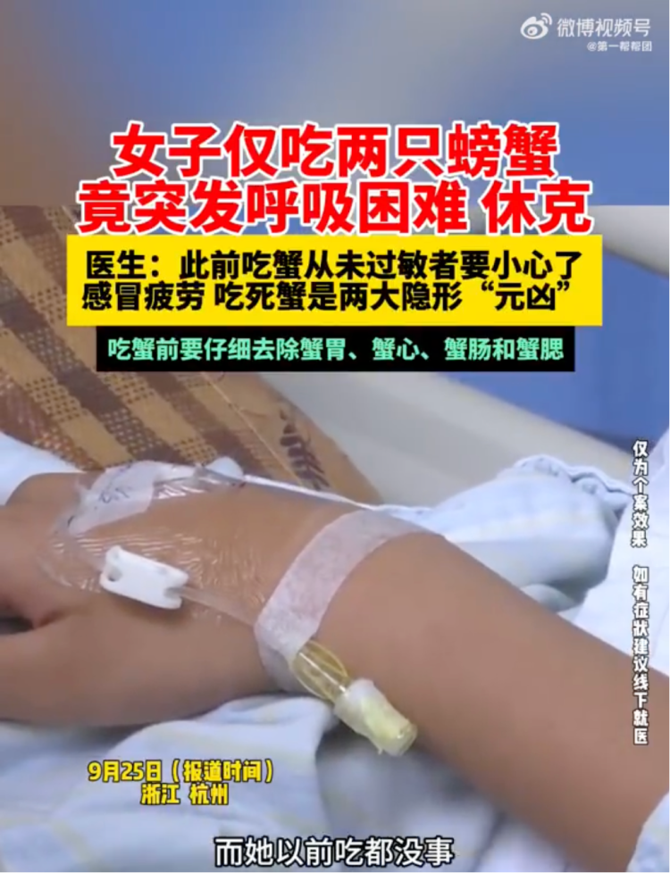 据福建广电《第一帮帮团》栏目报道,在食用两只螃蟹后,上述女子突然出现皮疹、呕吐、腹泻及呼吸困难等症状,送医后被确诊为过敏性休克,而该女子此前从未因吃螃蟹发生过过敏。
