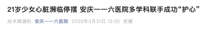 微信公号“安庆一一六医院”显示,该院确实曾于3月31日发布一篇题为《21岁少女心脏濒临停摆,安庆市一一六医院多学科联手成功“护心”》的文章,详细介绍了患者的诊疗过程。