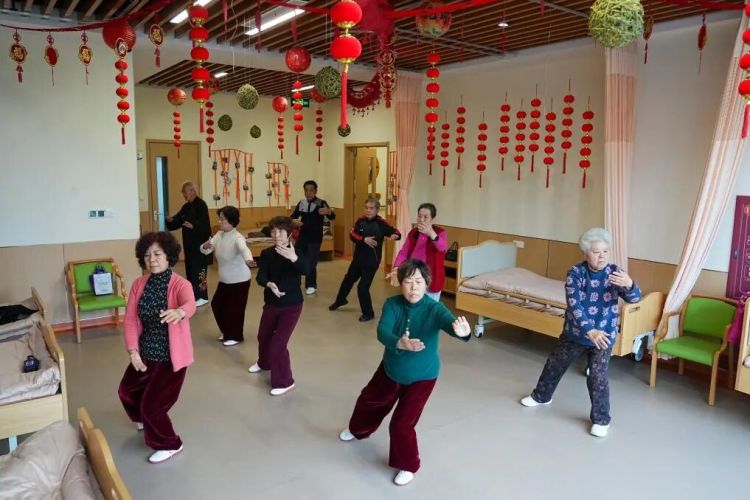 老人们在社区日间护理中心打太极拳。新华社记者 朱峥 摄