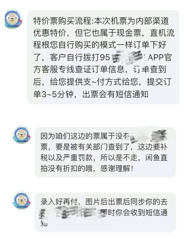 “当时对方说因为是‘内部票’,所以不能走闲鱼平台下单,还承诺我可以先出票、后付款。我看了一眼价格,给的折扣实在诱人,没法不心动。”张先生说。