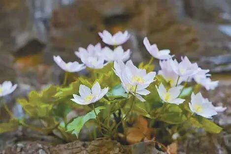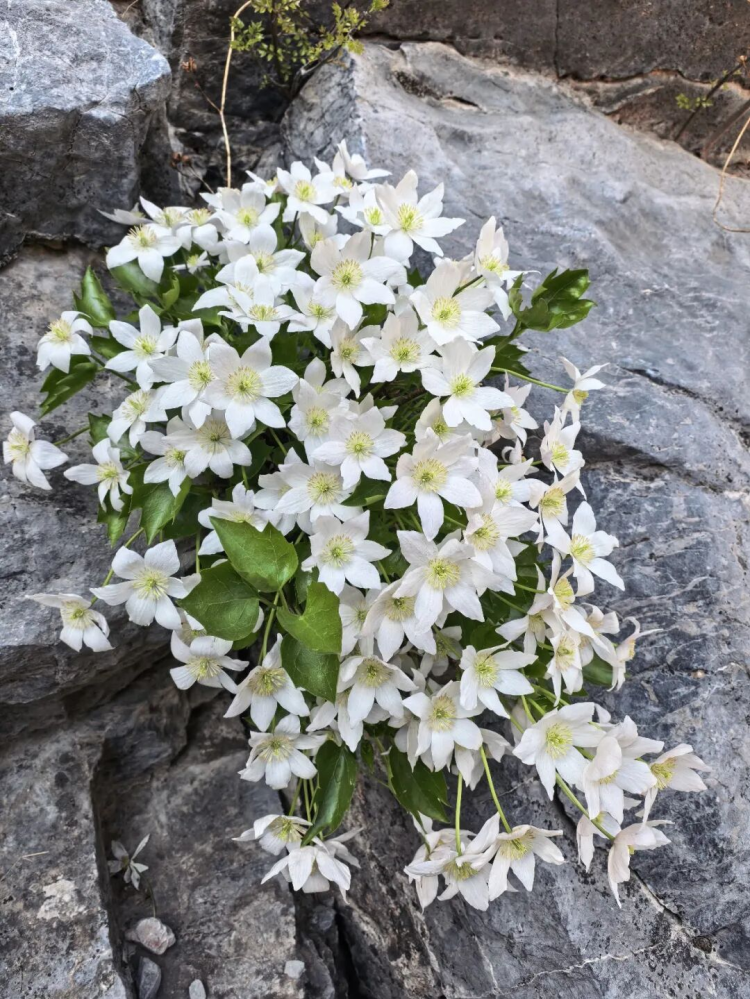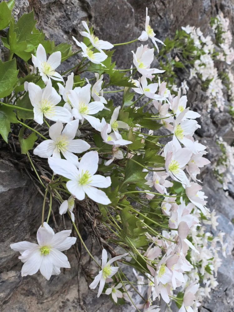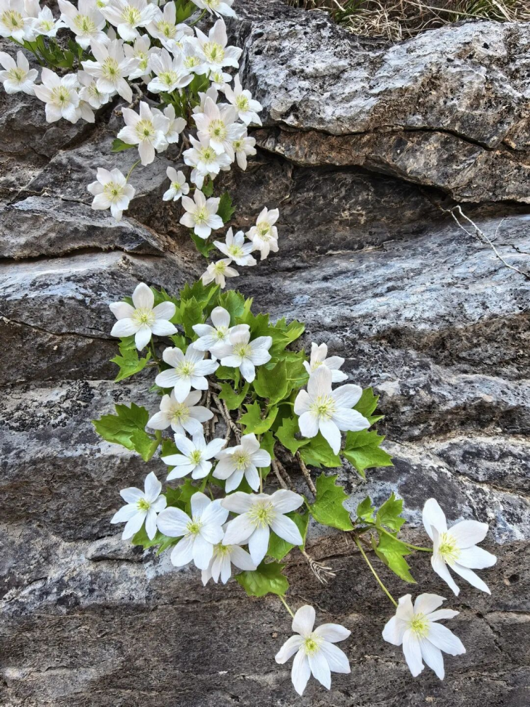 约莫走了半小时山路,一面20米高的崖壁豁然展现眼前,石头缝里长出一丛丛白色的清丽花朵,春风劲吹,这些野花像是跳起舞来,轻盈灵动。头一次看到这么大一片槭叶铁线莲,记者一时间愣住了,这种美所带来的冲击难以名状。