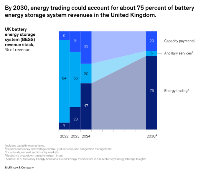 这一趋势并非中国独有。据麦肯锡2026年3月发布的报告《赋能未来:电池储能开发商的发展策略》,英国储能系统收入中能源交易占比已从2022年不足10%升至2024年约50%,并预计到2030年可达约75%。