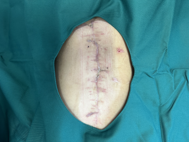 ■ 腹部正中有着长约20cm的陈旧手术切口,局部破溃流脓,初步脓液培养检出金黄色葡萄球菌;