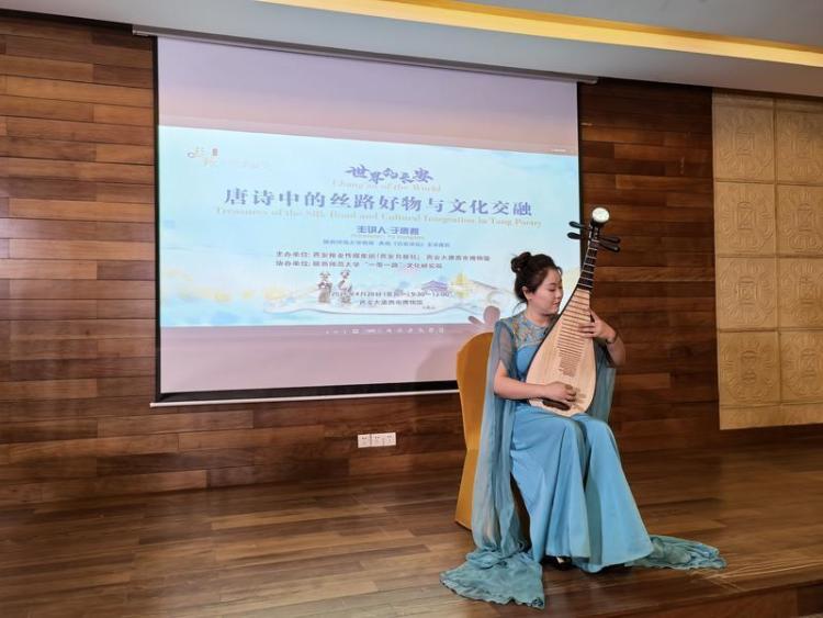 本次活动伊始,清丽婉转的琵琶声便萦绕现场。陕西省歌舞剧院青年琵琶演员王萌登台演奏了《诉——读唐诗<琵琶行>有感》《送我一支玫瑰花》等琵琶曲目,当悠扬的旋律从她指尖流出,丝路文化交流的历史脉络也向观众徐徐展开。