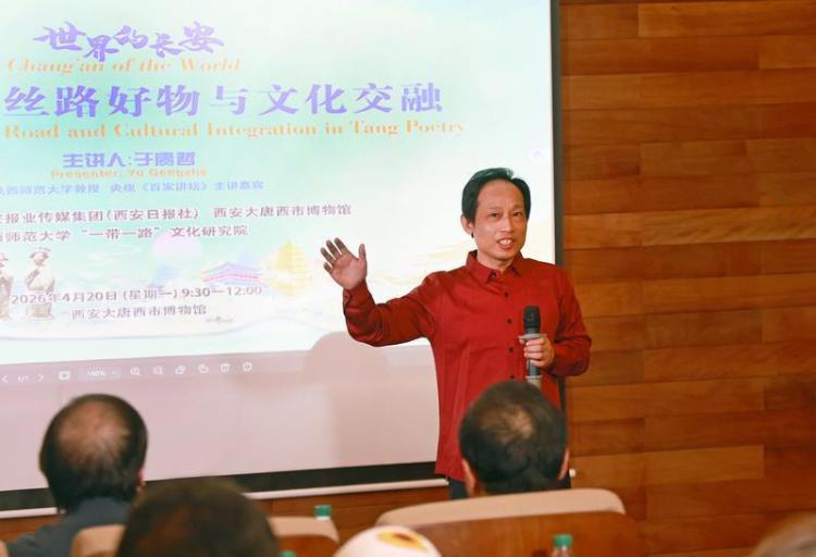 讲座中,于赓哲精准锚定“长安、唐诗、丝路”三大核心,围绕《世界的长安——唐诗中的丝路好物与文化交融》主题,以唐诗为切入点,将历史典故与丝路好物相结合,通俗易懂地解读了唐诗中蕴含的丝路商贸往来与文明交融细节。从石榴、葡萄、苜蓿等西域食材通过丝路传入长安,丰富人们餐桌,到琵琶、胡旋舞等西域艺术融入盛唐文化,成为唐诗创作的灵感源泉。于教授用生动的事例、风趣的语言,带领观众在唐诗的韵律中重走丝绸之路,感受盛唐长安的开放与繁华,让大家深刻体会到“长安”作为丝路起点的厚重底蕴、“唐诗”作为城市记忆载体的鲜活魅力,以及“丝路”作为文明纽带的重要价值。