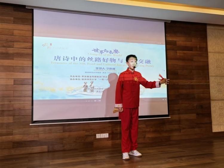 活动现场,国家级非物质文化遗产陕西快板传承人刘文龙先生的再传弟子、14岁的王皓琳同学,表演了陕西快板《长安夜市乐趣多》,生动介绍了通过丝绸之路传入长安的各类食材,以及由此衍生的西安特色美食,诙谐的语言、明快的节奏,让现场氛围愈发热烈。