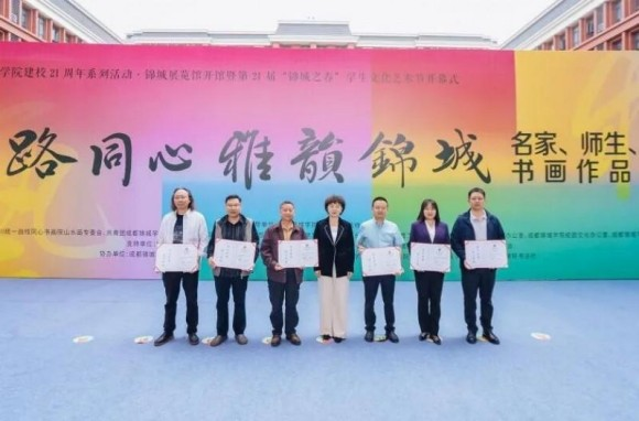 开幕式上,高朋满座,嘉宾云集。四川统一战线同心书画院山水画专委会、民建中央画院四川分院、四川省硬笔书法家协会、成都市书法家协会的各位书画名家、成都锦城学院各单位负责人、师生代表、校友代表等欢聚一堂,共同见证这场文化艺术盛宴的启幕。