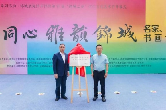 书画作品联展开幕式上,同步举行“硬笔书法教学基地”揭牌仪式。为进一步传承中华优秀传统文化,推动硬笔书法艺术在校园普及推广,成都锦城学院与四川省硬笔书法家协会达成校会合作携手育人,锦城学院党委书记刘永湘和四川省硬笔书法家协会主席、成都市书法家协会副主席康俊共同为基地揭牌。