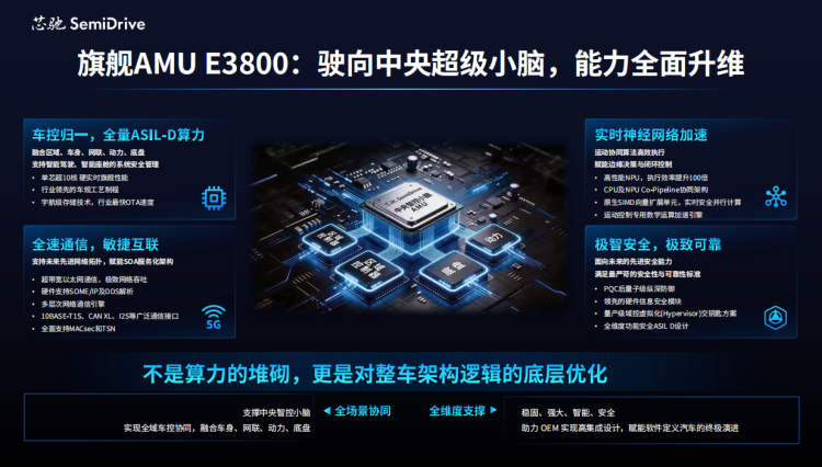 与此同时,芯驰还发布了E3610产品,这颗MCU芯片为IO型区域控制器而设计,配合中央小脑AMU算力基座,实现了对前沿电子电气(E/E)架构的整车级完整覆盖。