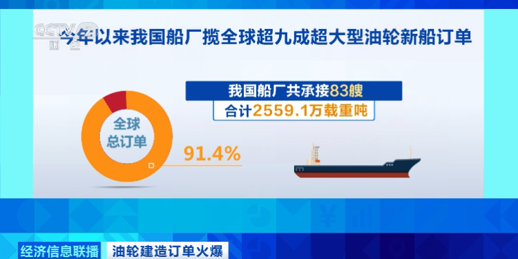 数据显示,今年以来,全球共有17家船东在7家船厂新订造91艘超大型油轮,合计2799.1万载重吨。其中,我国船厂共承接83艘,合计2559.1万载重吨,占全球总订单的91.4%。