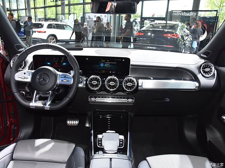AMG GLB 35的内饰设计与全新A级、全新B级等车型十分相似,液晶仪表与中控屏一体式的造型属于较为典型的设计,不过内部融入了碳纤维材质,并在中控台、门板处融入了红色点缀,以增强其运动感。AMG GLB 35保留了7座的设计,第二排座椅支持40:60比例放倒。