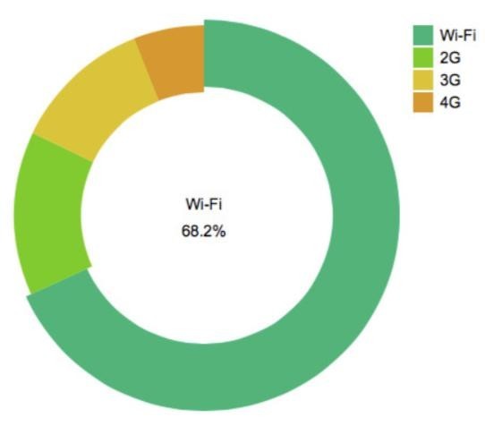终端wifi使用情况:真实的用户通常会使用wifi来下载和启动App参加网络课程。因此,如果wifi下面使用App的情况少于80%,则刷量的虚假用户数据风险较大。而对于普通App(所需流量较少),wifi下面的使用率在60%-70%之间。下图是普通App在正常情况下wifi和数据漫游服务使用的比率。