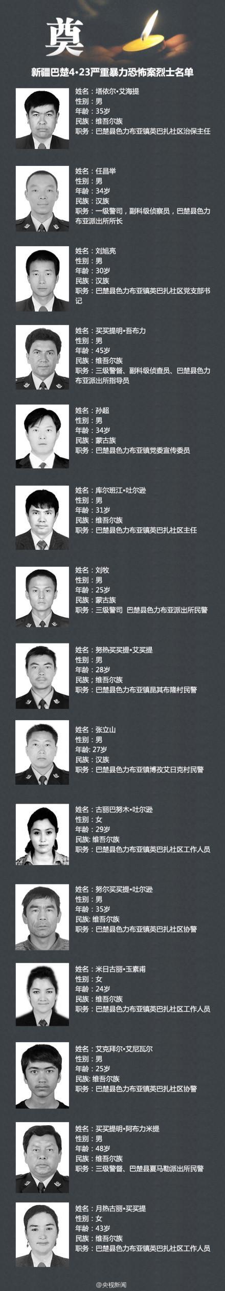 “4·23”暴力恐怖事件中,新疆巴楚县色力布亚镇派出所长任昌举击毙一名暴徒,6发子弹全部打完后被残忍地杀害。