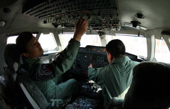 空军某试飞团团长张景亭(左)和副团长邓友明,每次试飞前都要认真细致的做试飞准备工作。特约记者谭超 摄