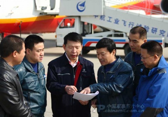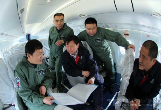 空军某试飞团团长张景亭和机组人员一走下飞机就与试飞院设计总师交流新客机ARJ121试飞情况。特约记者谭超 摄