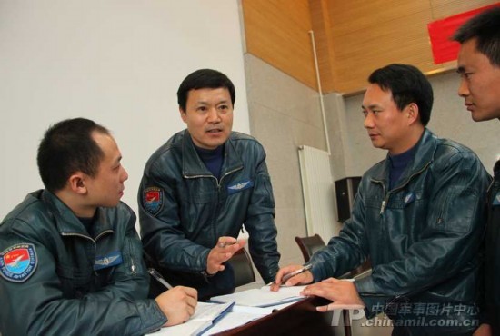 空军某试飞团团长张景亭(中)向试飞院课题组人员介绍歼十试飞情况。特约记者谭超 摄