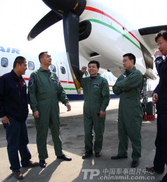 空军某试飞团团长张景亭和机组人员一走下飞机就与试飞院设计总师交流新客机ARJ121试飞情况。特约记者谭超 摄