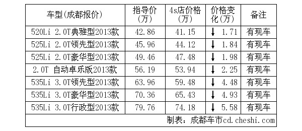 【网上车市成都讯】据宝马4S店销售人员表示:本月内购买宝马2013款5系Li 经销商报价42.86万元-79.76万元,优惠1.71万元-5.58万元,现价41.15万元-74.18万元,降幅比例4%-7%。8月购买5系还送1年车险。具体价格信息见下表: